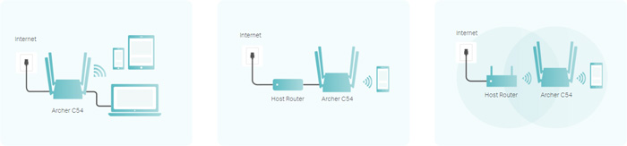 Tính linh hoạt là một điểm mạnh của Archer C54, với hỗ trợ cho ba chế độ làm việc bao gồm Bộ định tuyến (Router), Điểm truy cập (Access Point) và Bộ mở rộng phạm vi (Range Extender). Điều này cho phép người dùng tùy chỉnh thiết lập mạng của mình theo nhu cầu cụ thể.